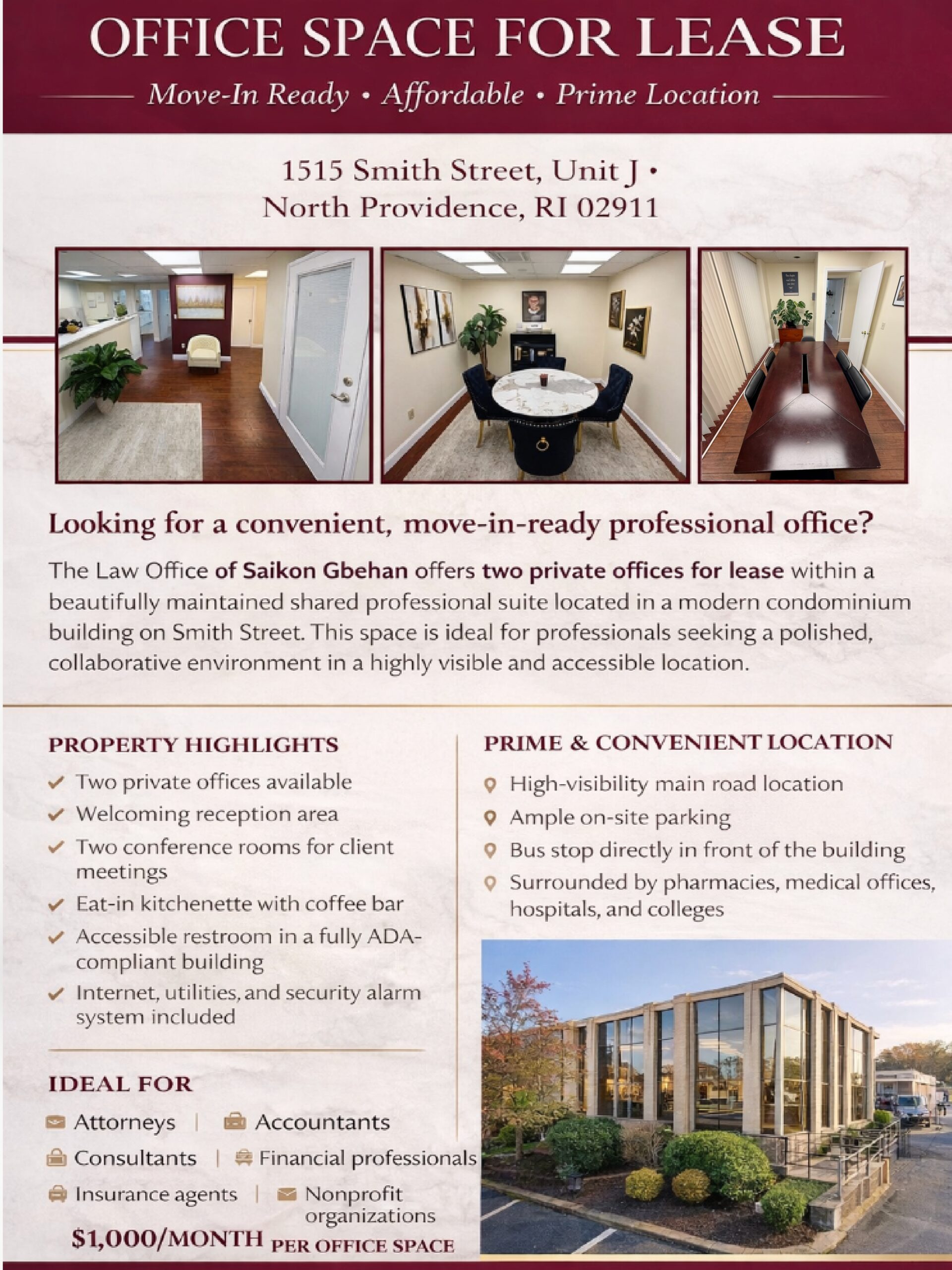 Looking for a convenient, move in ready professional office? The Law Office of Saikon Gbehan offers two private offices for lease at $1,000 per month per office within a beautifully maintained shared professional suite located at 1515 Smith Street, Unit J, North Providence. This modern condominium building is situated in a prime, high visibility location and offers on site parking for tenants and visitors, with a bus stop directly in front of the building.